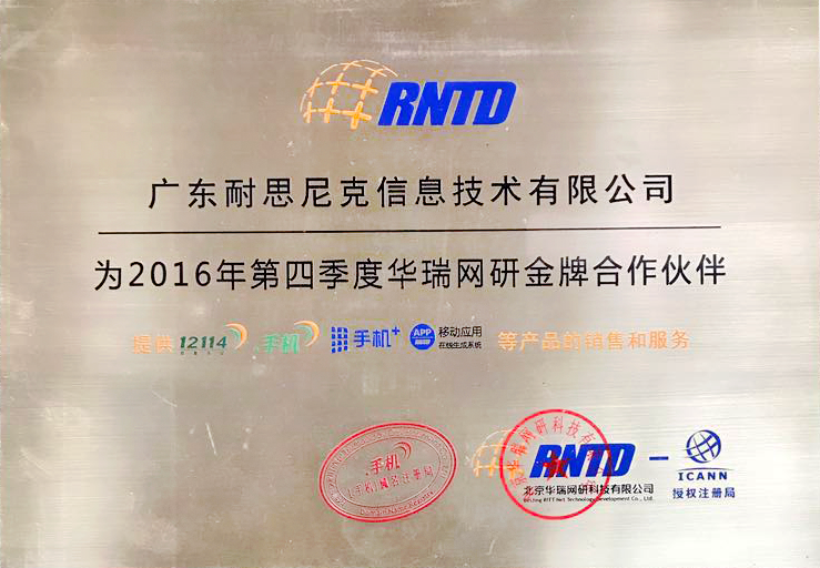 2016年第四季度華瑞網(wǎng)研金牌合作伙伴