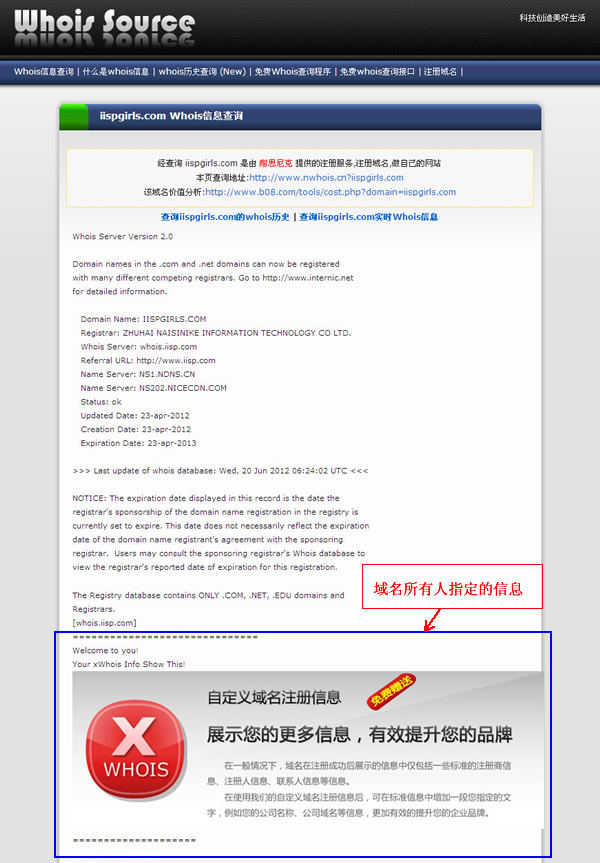 請看 iispgirls.com 的Whois形象廣告服務(wù)實例: