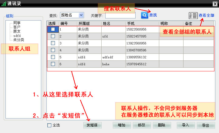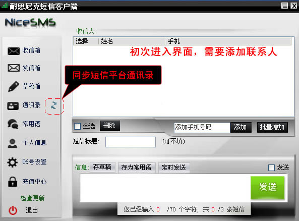 第三步,初次進(jìn)入界面需要添加聯(lián)系人,如果短信平臺已經(jīng)有聯(lián)系人,可以使用“同步聯(lián)系人”功能將聯(lián)系人同步到客戶端